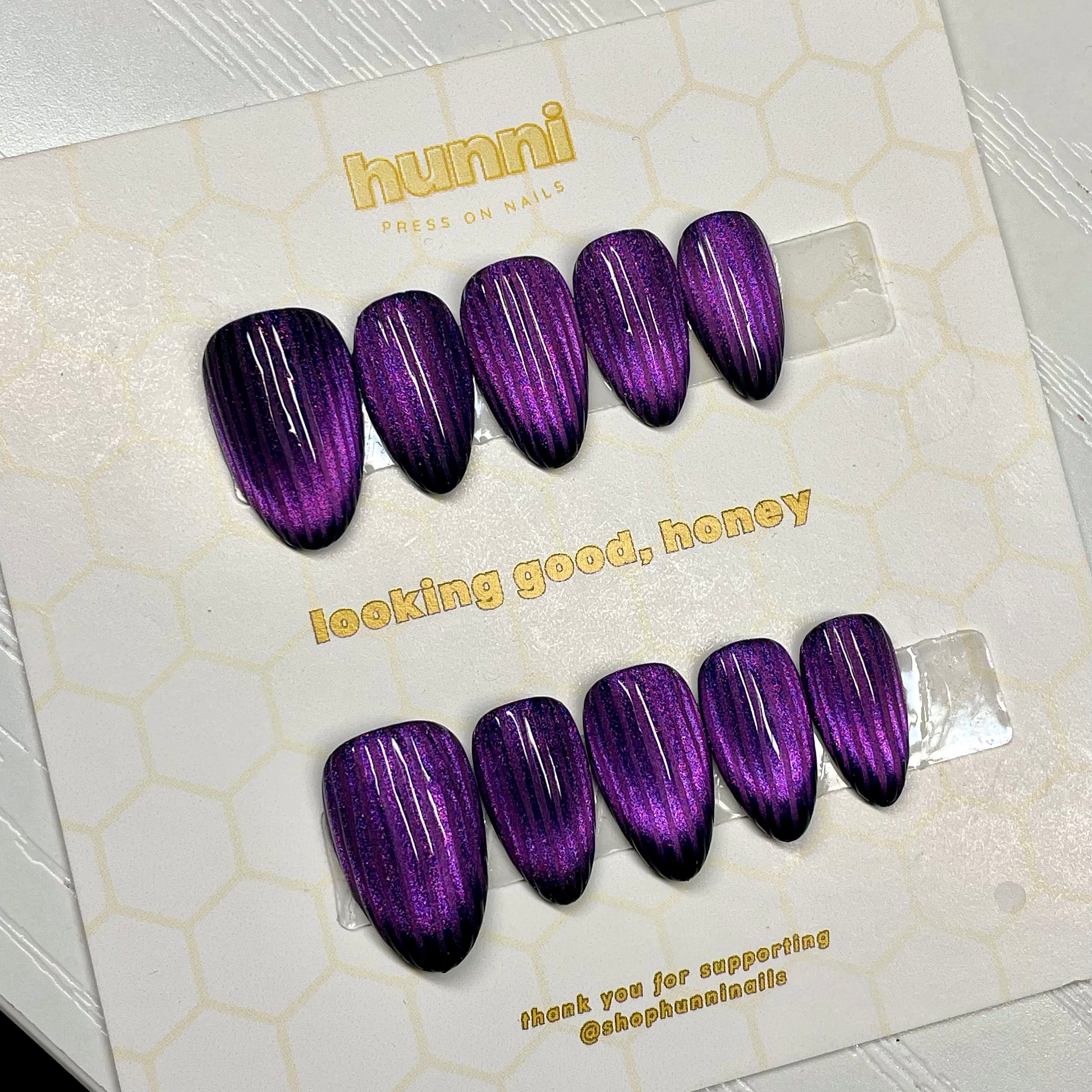 Witchy nails but make them chic! This nail features a stunning purple cateye french tip and barely-there lines for a unique matte & glossy finish!